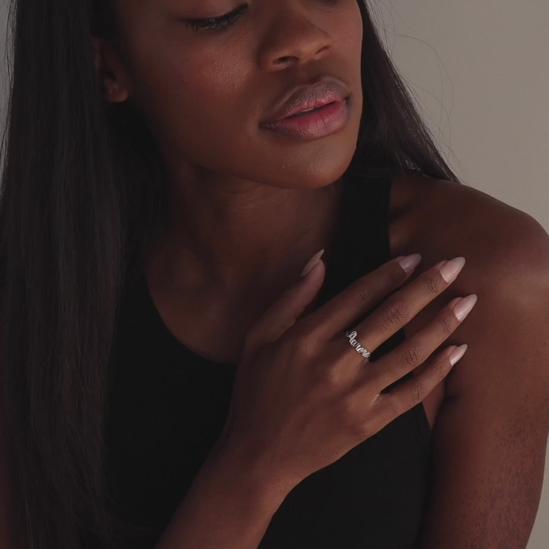 The Grace Script Name Ring is crafted with a stunning script font, in the lettering of your choosing. This personalized piece will immediately become a part of your daily rotation.